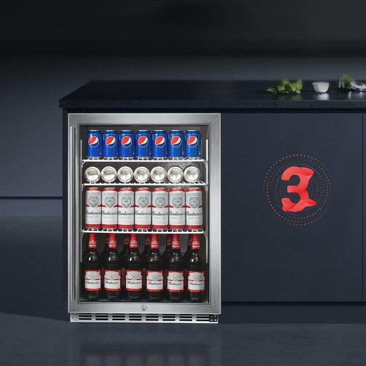 ICEJUNGLE 24'' Beverage Refrigerator Cooler is the perfect solution for your outdoor adventures! This refrigerator is equipped with a large internal storage design that can hold up to 160 standard-sized soda or beer cans, or several bottles of wine, so you can keep all of your favorite beverages cold and ready to enjoy. Plus, it has 3 adjustable and removable chrome shelves so you can easily plan the internal storage space of the refrigerator.