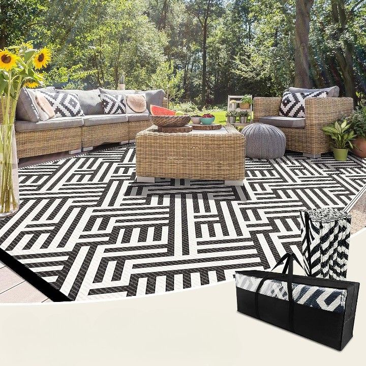 LILIOFFIC Reversible Mats - Plastic Straw Rug, Outdoor Rugs are the best RV patio mats for any patio decor. Our outdoor rugs are made with polypropylene and tightly woven for a comfortable feeling underfoot. They are reversible, double weave, allowing you to have two different looks in a matter of seconds. This outdoor rug is very lightweight and has low static electricity, making it perfect for any environment. It is also quick and easy to clean, just remove dirt with water and dry. Plus, this rug comes with a carrying bag and case for more convenience.