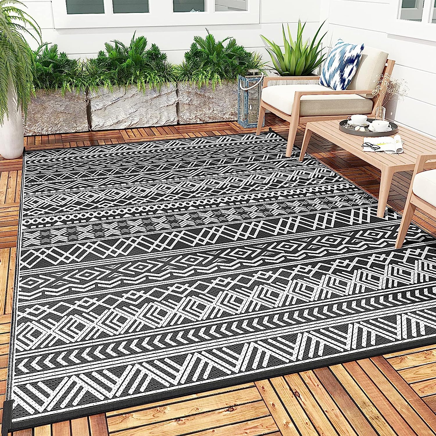 GENIMO Outdoor Rug for Patio Clearance is the perfect rug for any outdoor space! With its reversible design, it can withstand the natural wear and tear of the outside world. Plus, it is made with tightly woven plastic technology which will make your feet feel soft and protect your child's skin, grass, and deck. The design of two classic geometric patterns can be used interchangeably to enhance your experience, while the dark color hides dirt better and keeps your outdoor mat looking new for a long time. Plus, GENIMO Outdoor Rug is 100% recyclable and reusable, so you can give back to nature!