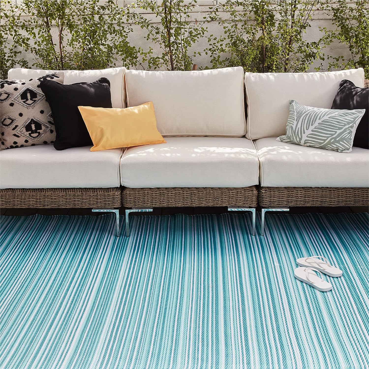 GEUOYEE Reversible Mats - Plastic Straw Rug, Outdoor Rug, Modern Area Rugs have it all! They are made with 100% virgin polypropylene for a comfortable feeling underfoot. Not only that, but they are reversible, double weave, allowing you to have two different looks in a matter of seconds. They are also UV and water-resistant, perfect for any weather condition. Plus, their heat-treated edging makes them durable and long-lasting.