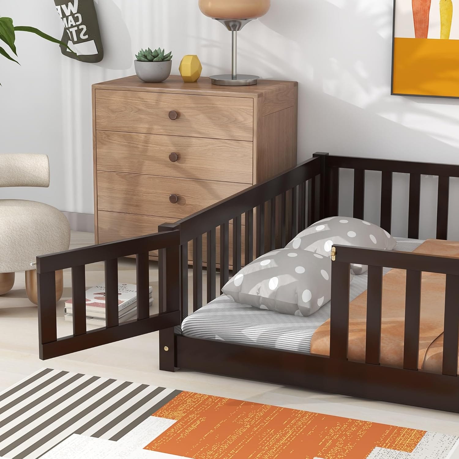 When considering a Montessori bed, particularly for active kids or toddlers, the addition of a floor bed with rails offers an extra layer of security that many parents find comforting. These rails are designed to be low yet effective, preventing babies from rolling out during sleep but still allowing them the independence to climb in and out of bed safely. This feature is especially appealing for parents transitioning their child from a crib, as it maintains the safety features they're accustomed to, while fostering their child's growing autonomy.