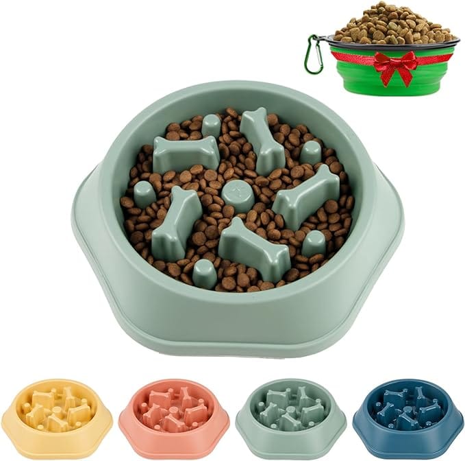 A slow-feeder dog bowl, also known as a "slow feed bowl" or "slow feeder", is a type of dog bowl designed to slow down the rate at which dogs eat their food. Unlike a regular dog food bowl, these bowls have raised sections or different patterns that create a sort of puzzle that the dog has to navigate to get to their food. This makes the dog eat slower, promoting better digestion and reducing the risk of digestive issues like bloating and regurgitation.
