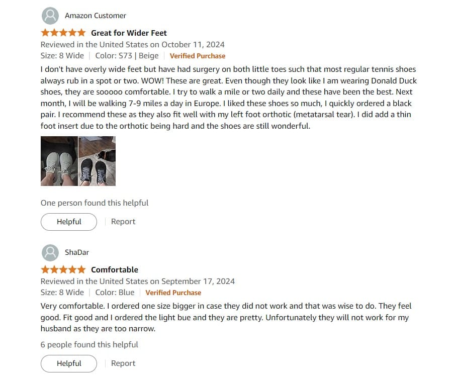 Comfortable Fit: The wide toe box allows for natural foot movement, reducing discomfort during long walks or extended wear.